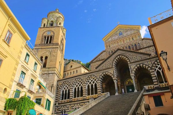 Auf dem Domplatz schlägt das Herz des pulsierenden Küstenortes. Er bildet das romantische Stadtbild von Amalfi. Sie erreichen den Dom Sant’Andrea über majestätische Stufen, die an die spanische Treppe erinnern. Die Kathedrale Sant’Andrea beeindruckt durch ihre Größe und die prachtvolle Ausschmückung.