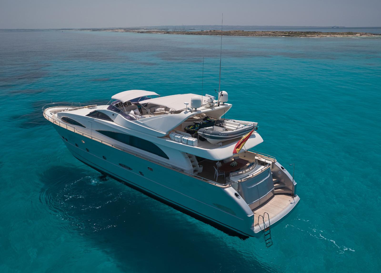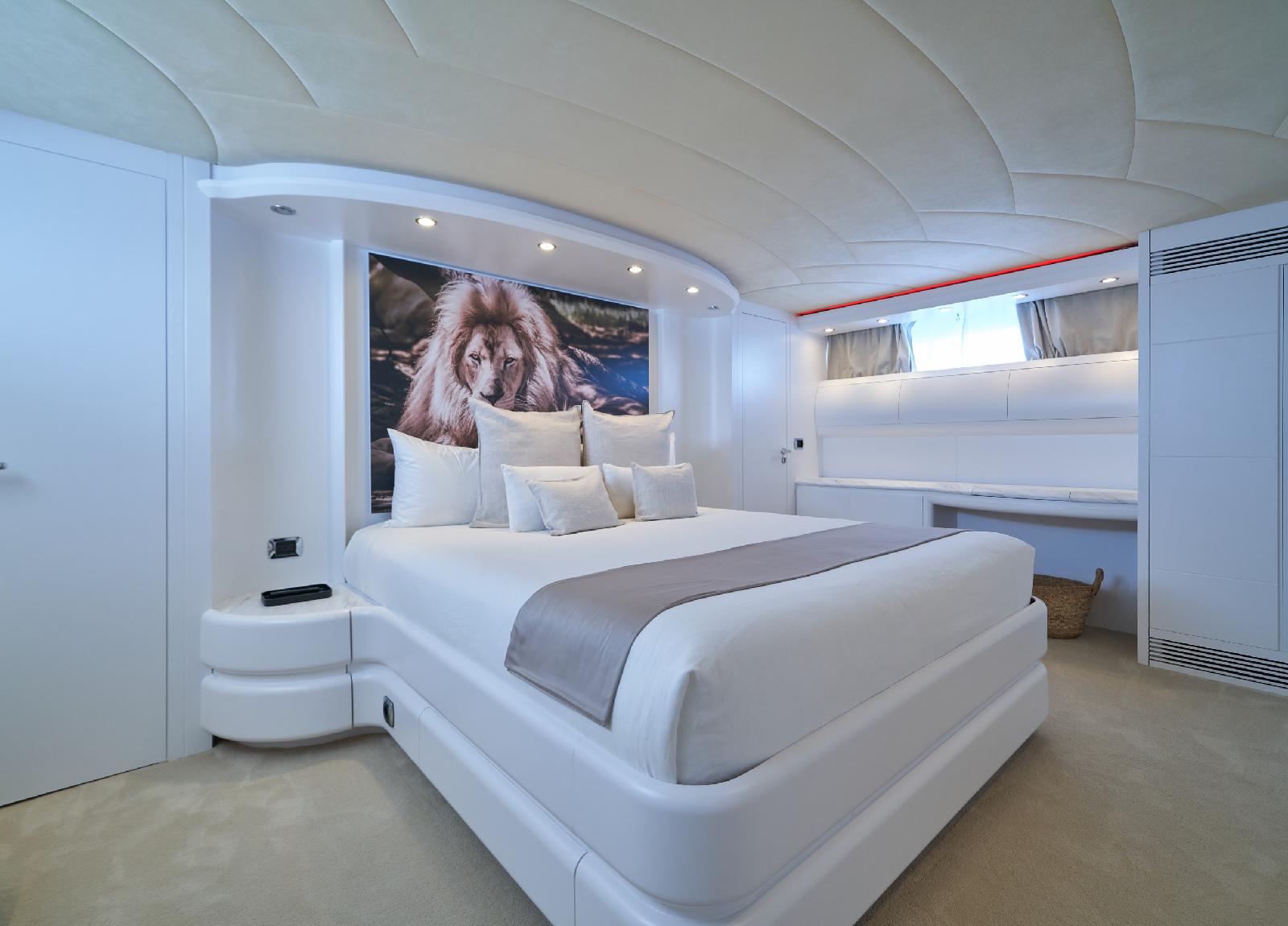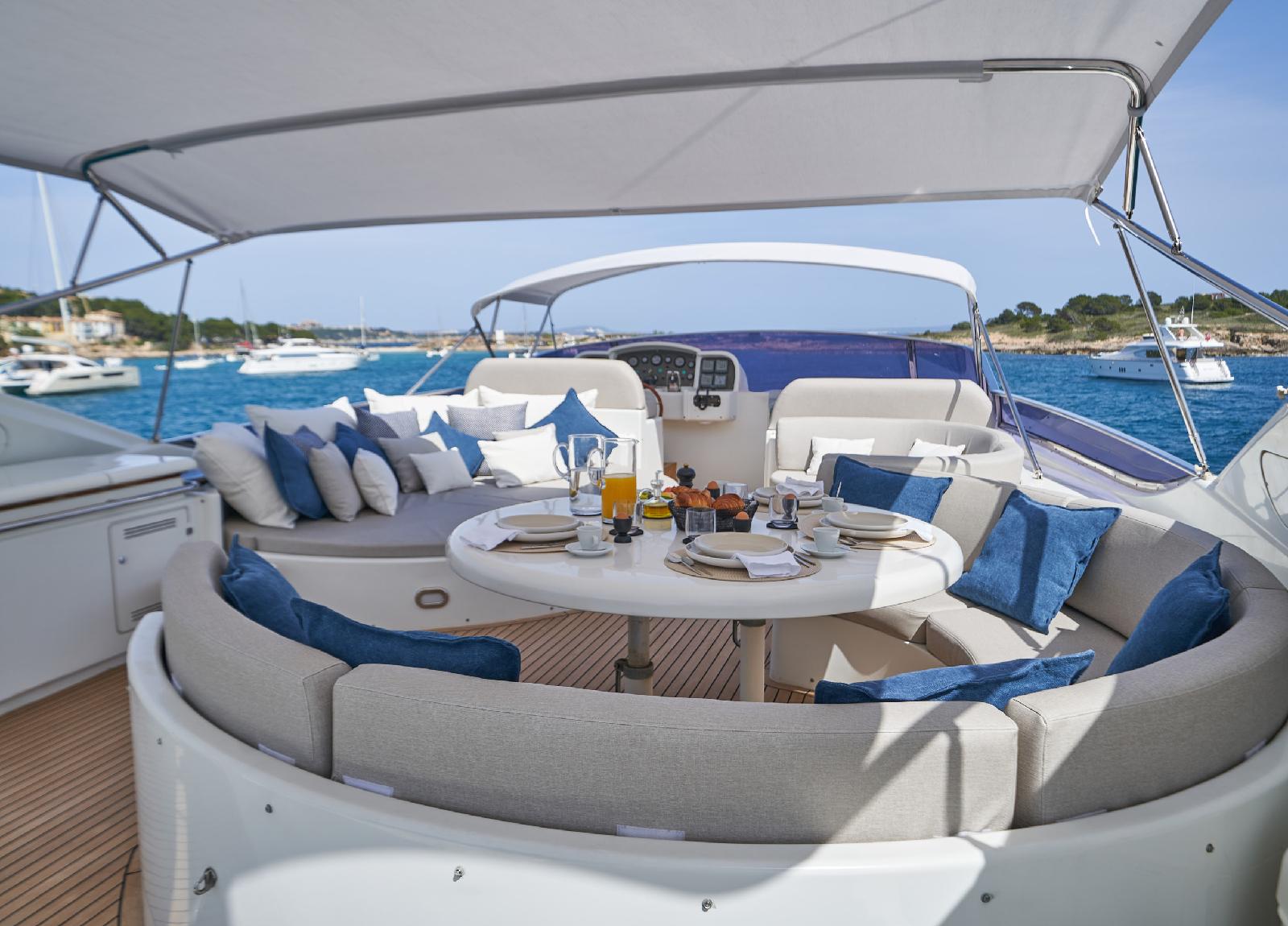Es gibt Platz für bis zu 10 Gäste in 4 geräumigen Kabinen. Mit einem Refit im Jahr 2022 bietet die Yacht ein luxuriöses und frisches Ambiente. Zu den herausragenden Merkmalen gehören eine üppige Flybridge mit einer großzügigen Sonnenterrasse, einem Esstisch sowie einer Wet-Bar. Eine 4-köpfige Crew kümmert sich um die volle Zufriedenheit aller Gäste und zaubert kulinarische Köstlichkeiten auf dem Grill.