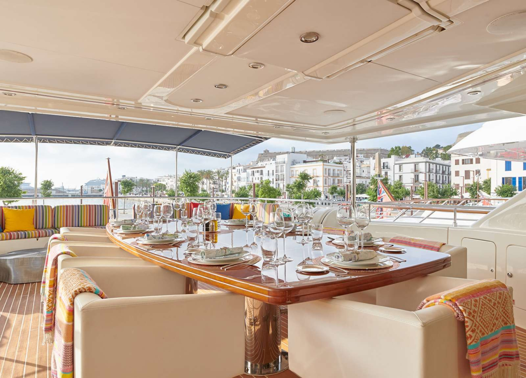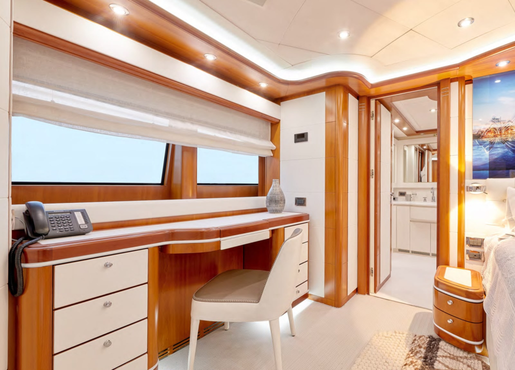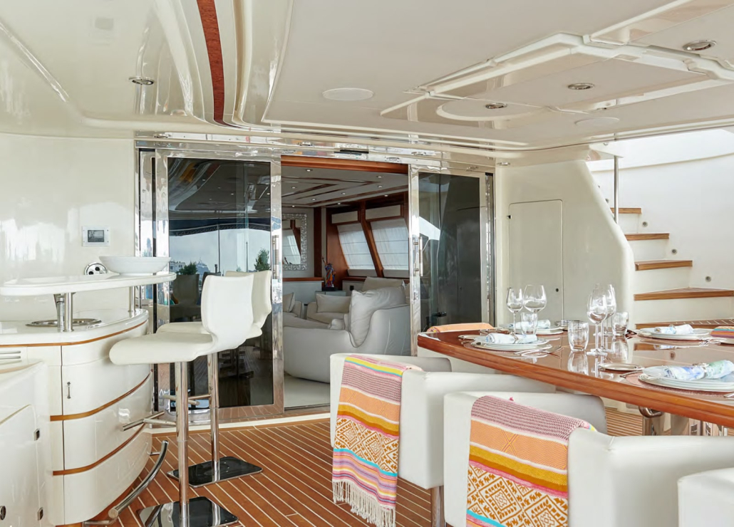 Bunker wurde von der italienischen Werft CRN gebaut und von Zuccon International Project entworfen und befindet sich nach einem kompletten Refit in makellosem Zustand. Weißes, weiches Leder an den Wänden, weißes Teakdeck, atemberaubende Art-Deco-Kunstwerke in leuchtenden Farben und alles ergänzt durch LED-Beleuchtung. Das eigentliche Interieur des Bunkers ist Kunst an sich. Die gesamte Bettwäsche, Handtücher und andere Haushaltsgegenstände sind von großen Modehäusern wie Hermes & Roberto Cavalli.