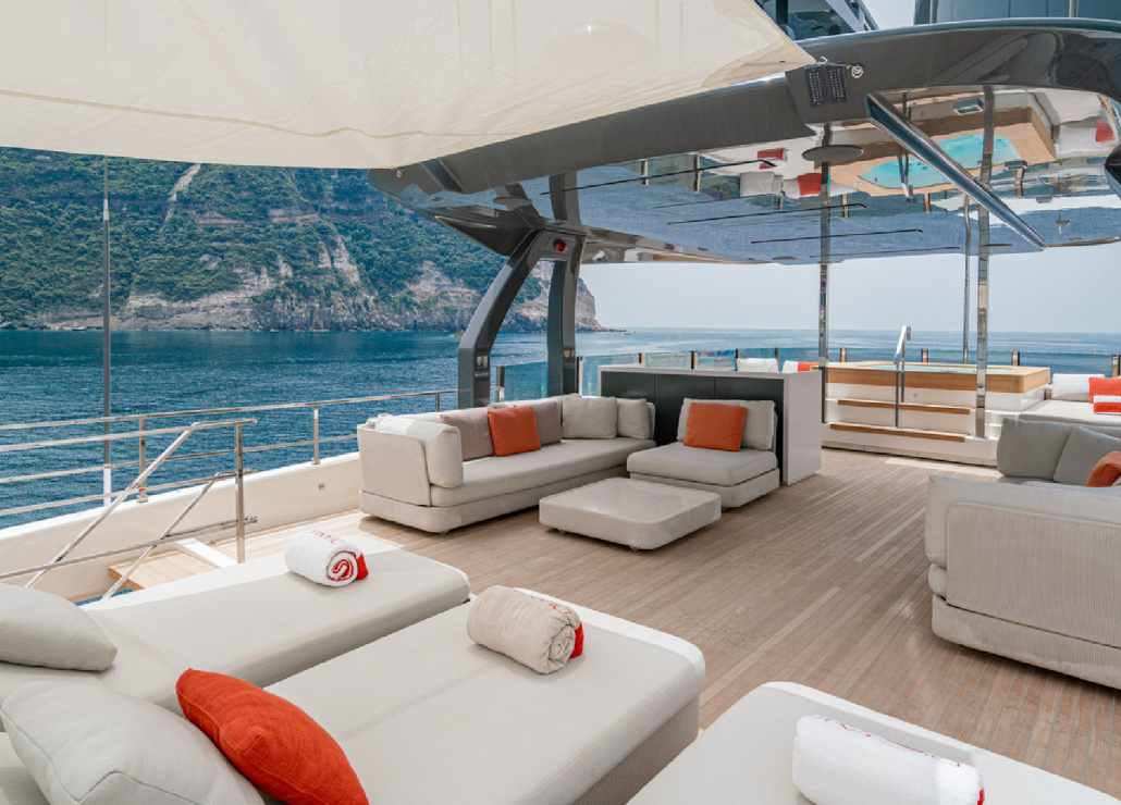Auf dem Sonnendeck erwarten Sie ein Jacuzzi, Sonnenliegen und ein schattiger Lounge-Bereich.