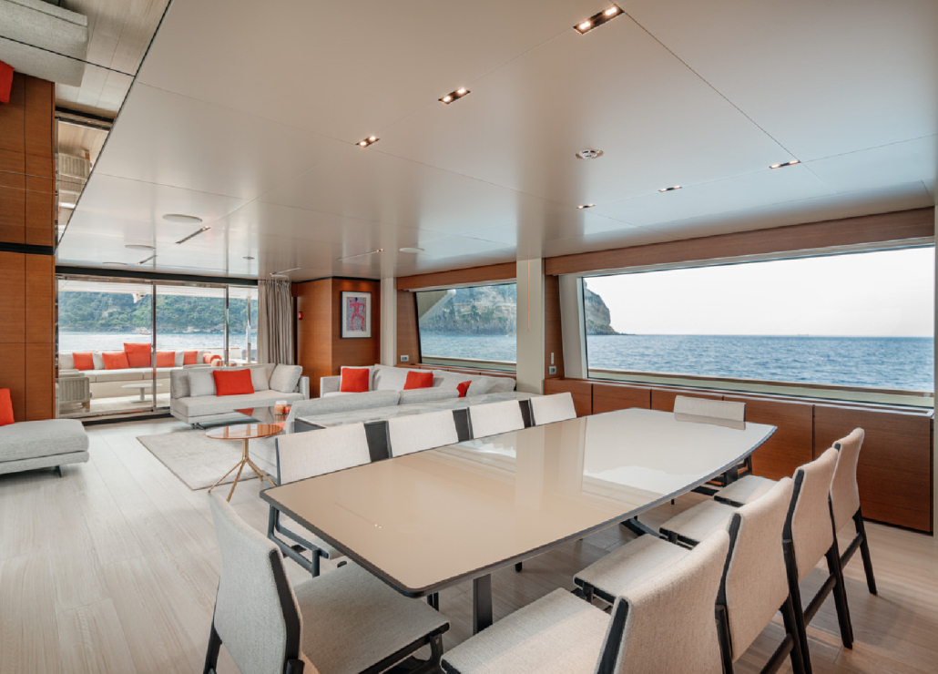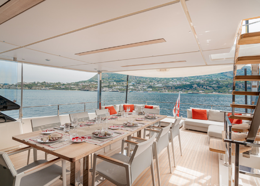 Das Oberdeck bietet Privatsphäre und einen großen Esstisch für Mahlzeiten im Freien. Der Hauptsalon besticht durch seine geräumige Lounge und viel Tageslicht.