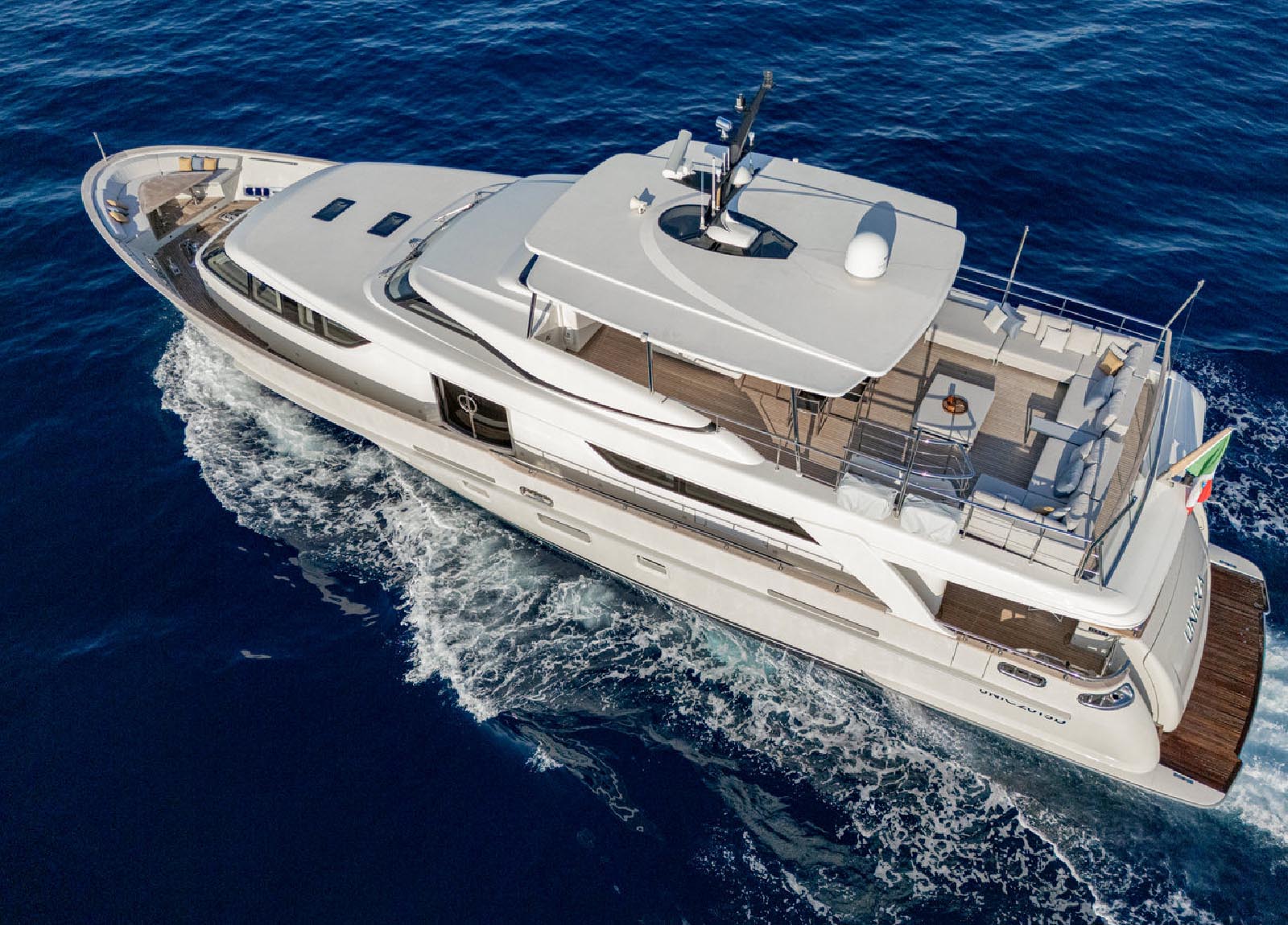 Die unkonventionelle Atmosphäre setzt sich auf der Flybrige fort, die mit einer einzigartigen runden Sitzgruppe ausgestattet ist und sich perfekt für Familien eignet. Zusätzlich machen ein Jacuzzi und ein verschiebbares Bimini diesen Bereich ideal, um das Meer zu genießen.