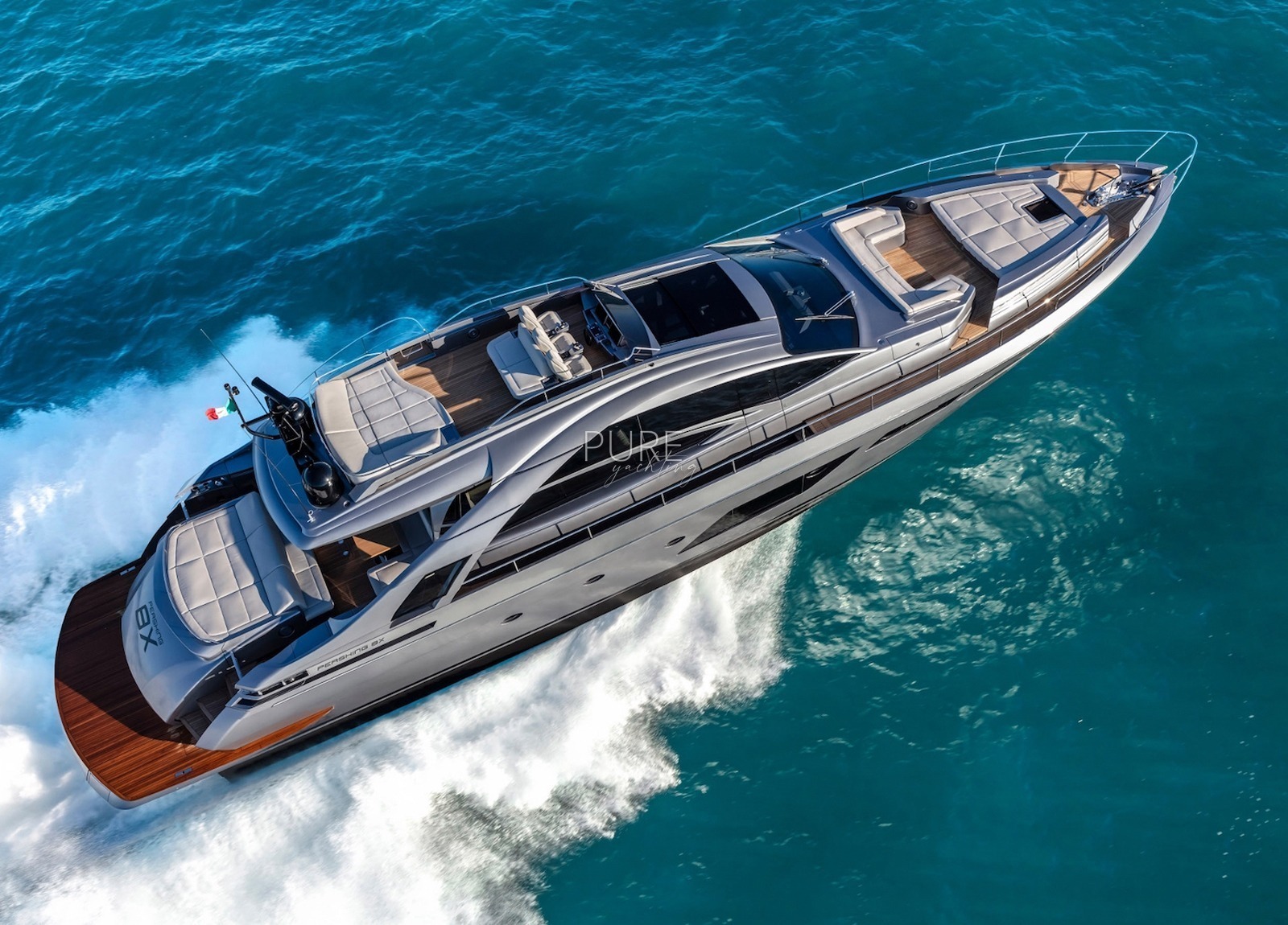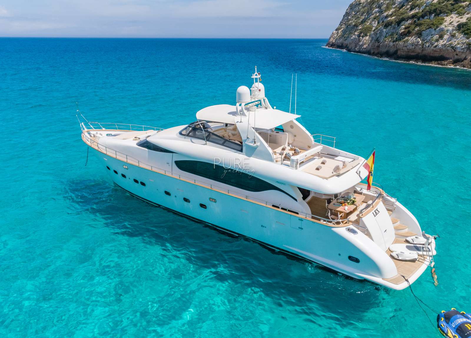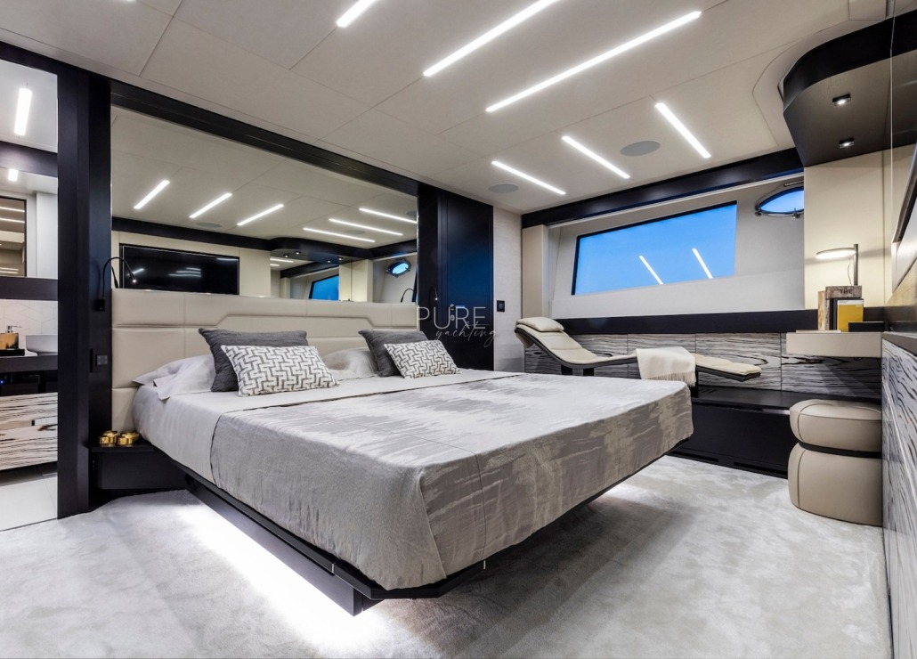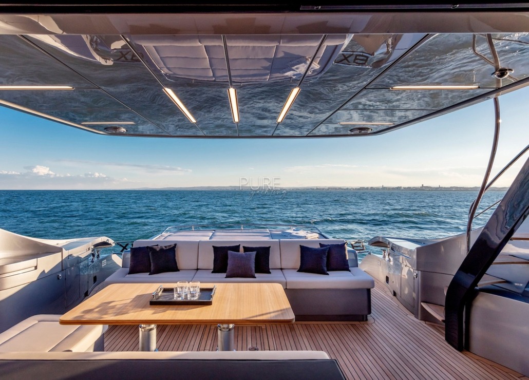 Die Luxusyacht verfügt über viele exquisite Highlights, darunter ein Unterwasser-Soundsystem und eine Unterwasser-Beleuchtung. Die geräumige Sport Fly verfügt über eine 5 qm große Sonnenliege mit der Option eines Bimini für entspannte Stunden an Deck.