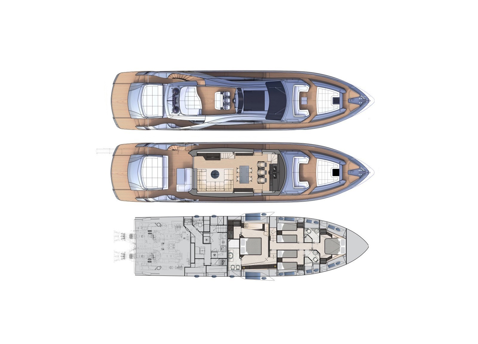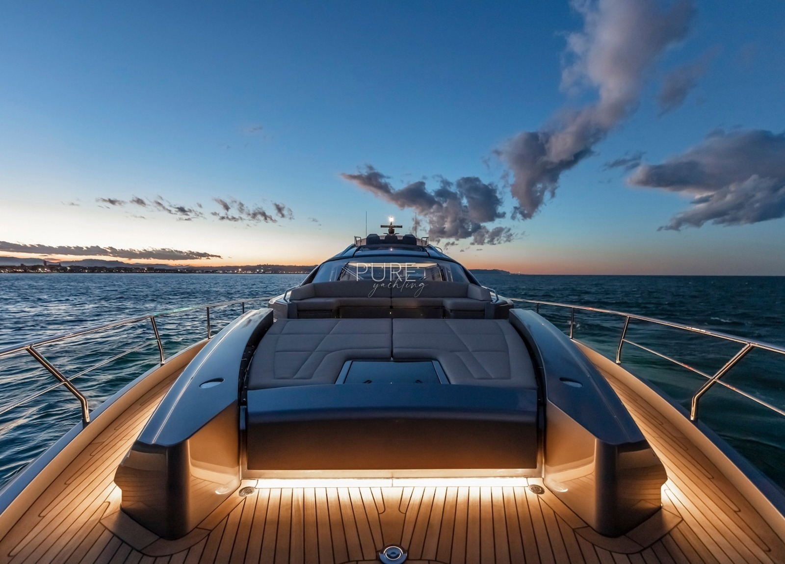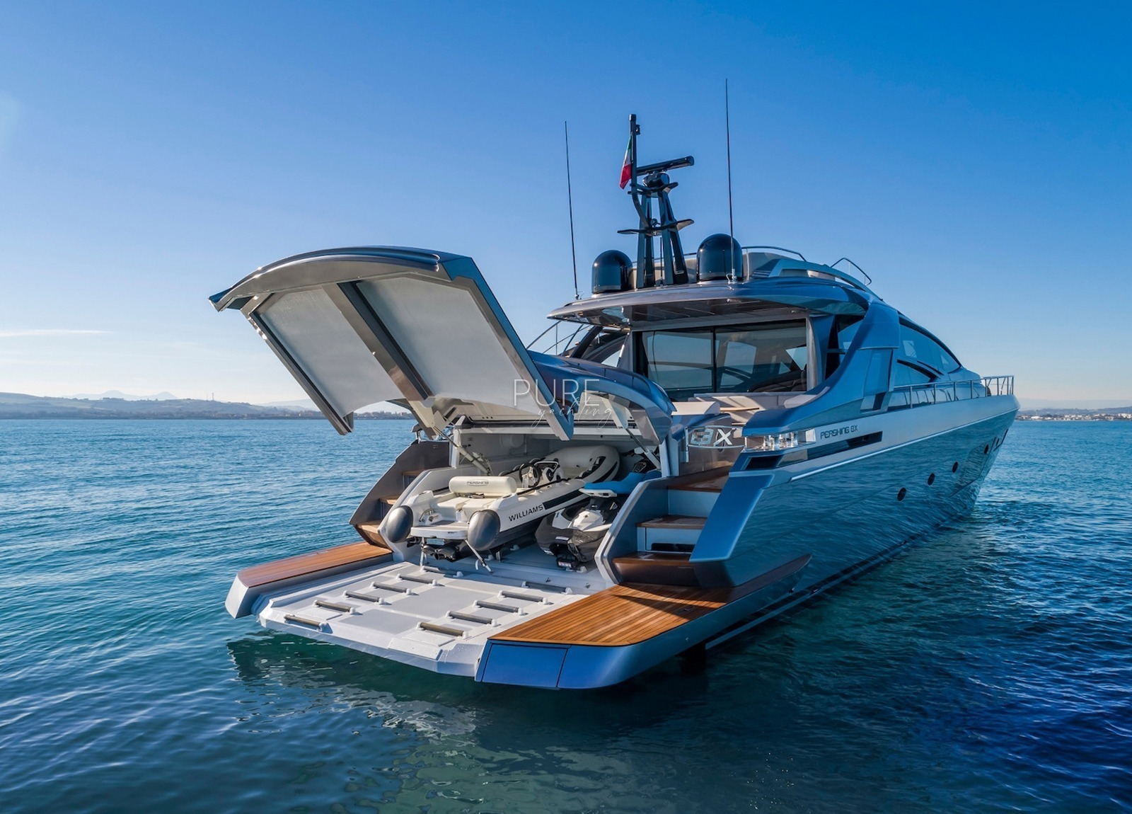Die Luxusyacht verfügt über viele exquisite Highlights, darunter ein Unterwasser-Soundsystem und eine Unterwasser-Beleuchtung. Die geräumige Sport Fly verfügt über eine 5 qm große Sonnenliege mit der Option eines Bimini für entspannte Stunden an Deck.