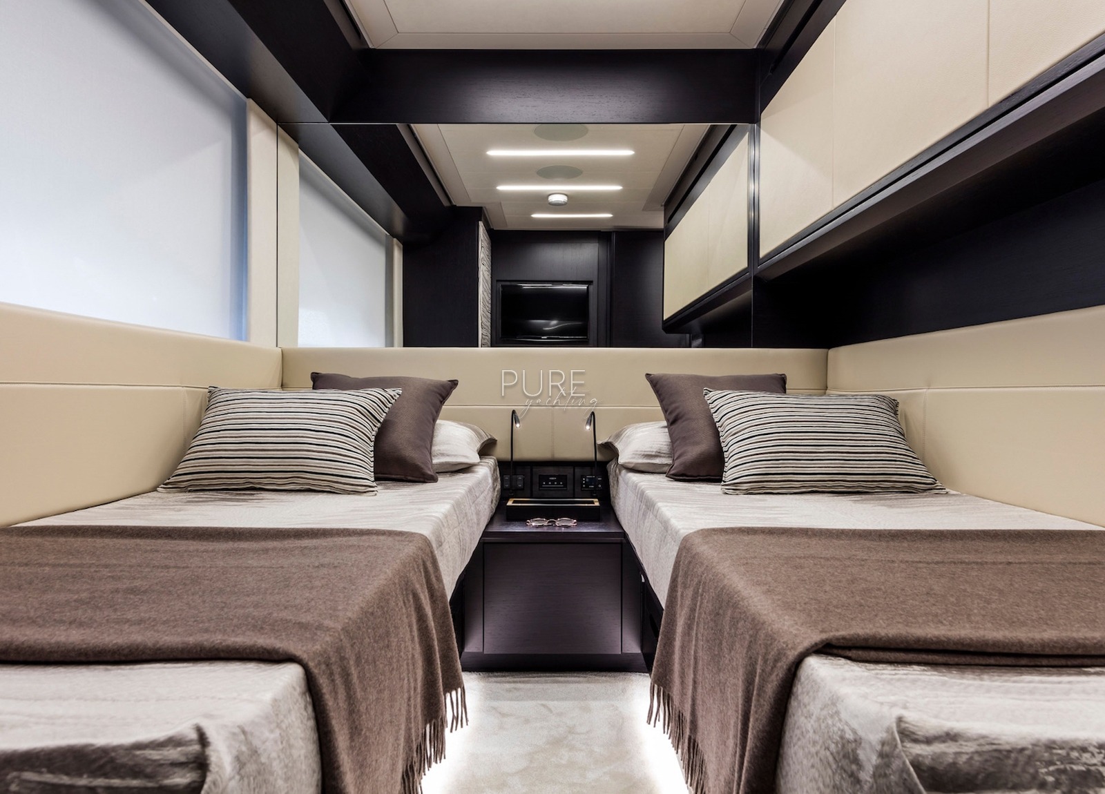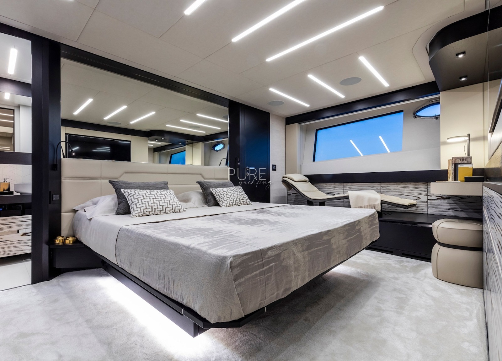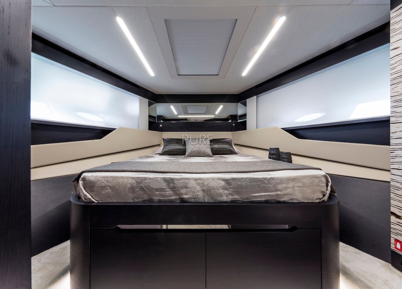 Beyond kann 12 Gäste auf Tagestouren und 9 Gäste bei Nacht beherbergen. Die Yacht verfügt über vier hervorragend ausgestattete Kabinen, darunter eine 20 qm große Mastersuite mit begehbarem Kleiderschrank und eigenem Bad. Eine VIP-Kabine und zwei Doppelkabinen, eine davon mit einer dritten Koje, bieten Platz für weitere Gäste.