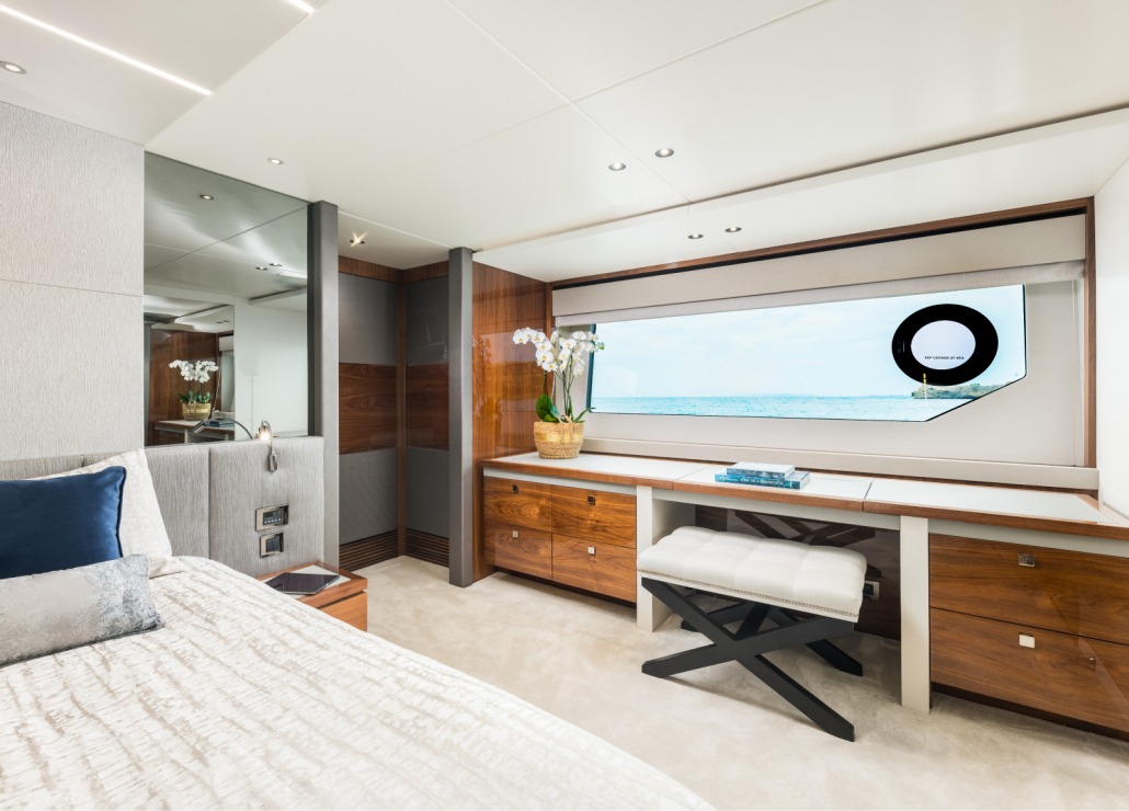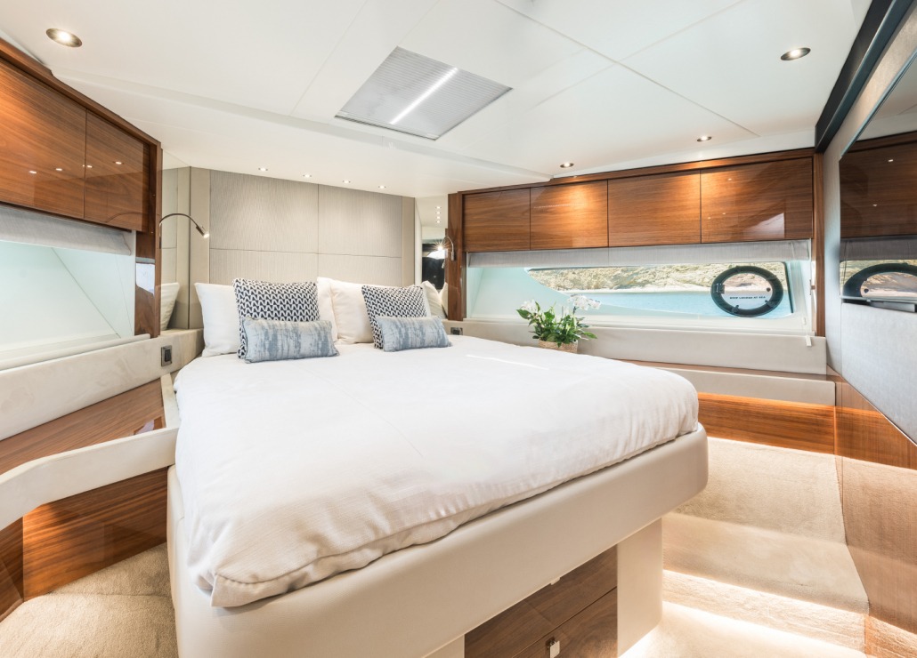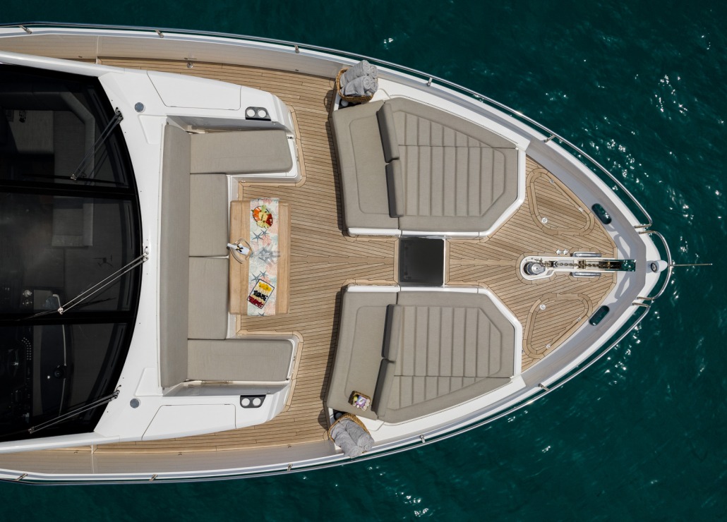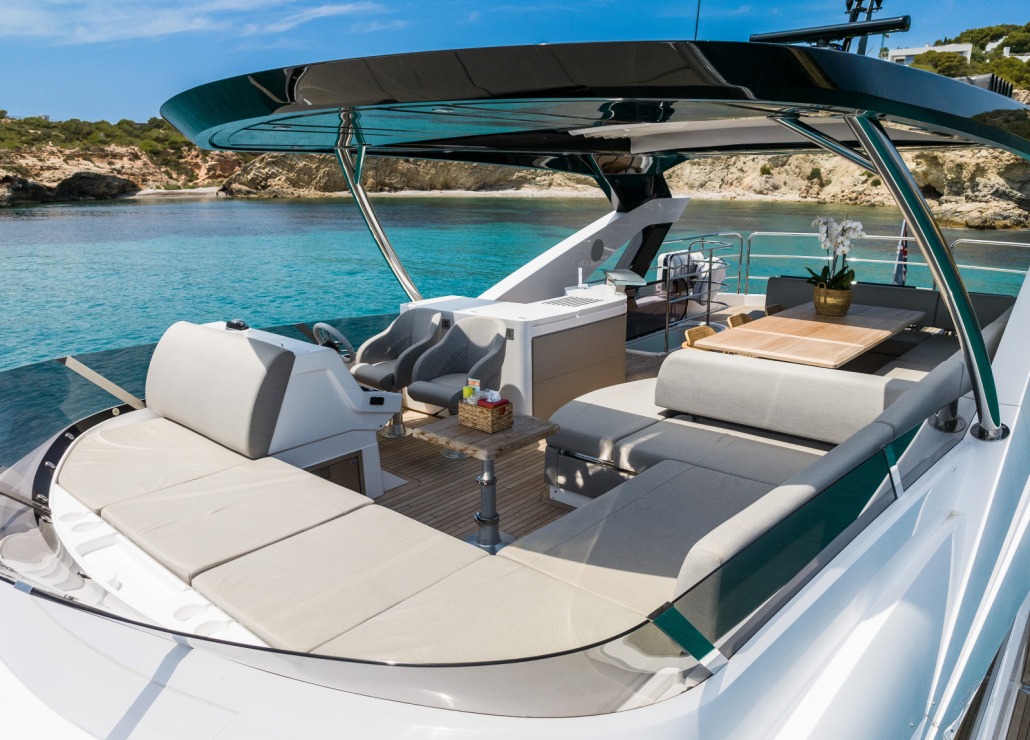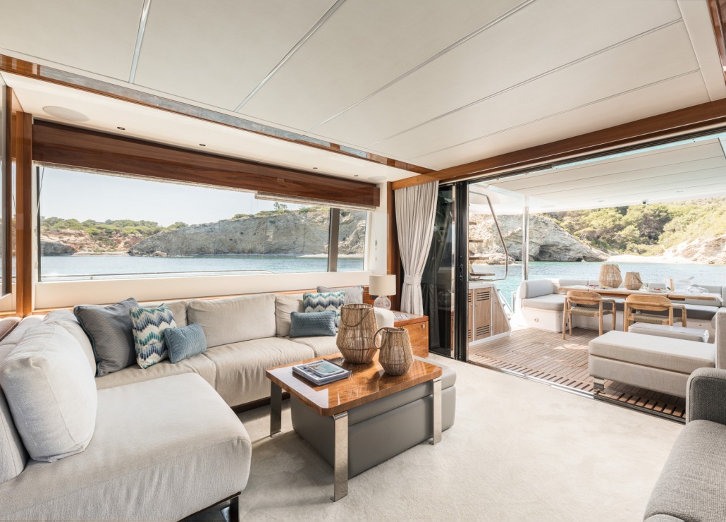 Das Innere der Yacht bietet ein einladendes Ambiente mit lichtdurchfluteten Kabinen. Im Außenbereich bietet die SAAHSA vielseitige Bereiche zum Sonnenbaden und für Mahlzeiten, die durch eine atemberaubende Aussicht ergänzt werden. Die geräumige Flybridge und die Sitzgelegenheiten auf dem Vordeck sind ideal, um Zeit mit Familie und Freunden zu verbringen.